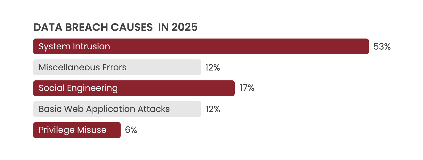 Ransomware attacks, data breaches, and insider threats are just a few of the issues that organizations frequently face, as the surge in AI growth provides bad actors with more avenues to target organizations. According to Verizon’s Data Breach Investigations Report, exploitation of vulnerabilities reached a 20% share, while the presence of ransomware grew by 37% year-over-year. Meanwhile, the number of ransom payments dropped, as victims were less willing to pay the ransom. The general overview of the data breach causes in 2025 is presented in the graph below: