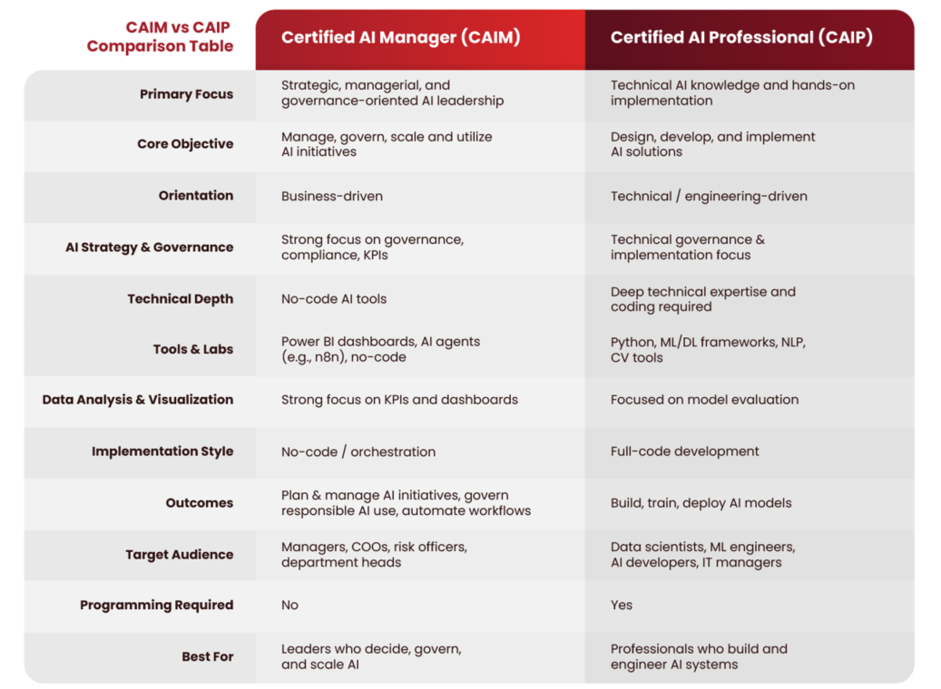 The Certified Artificial Intelligence Professional (CAIP) and Certified Artificial Intelligence Manager (CAIM) certifications are designed for these separate functions. They complement one another, but they are not interchangeable. The choice between CAIP and CAIM comes down to a simple question: Are you developing AI systems or leading AI programs? CAIP focuses on building AI, while CAIM focuses on governing it.