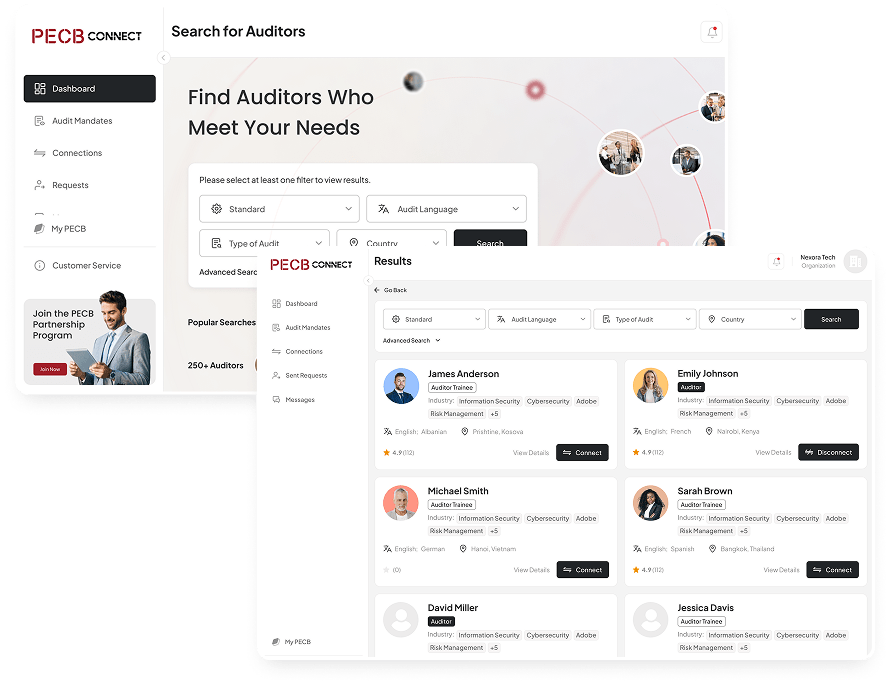 Easily find and connect with qualified auditors who meet your organization’s needs. Join PECB Connect to simplify the process of finding professionals for certification, compliance, or internal audits.