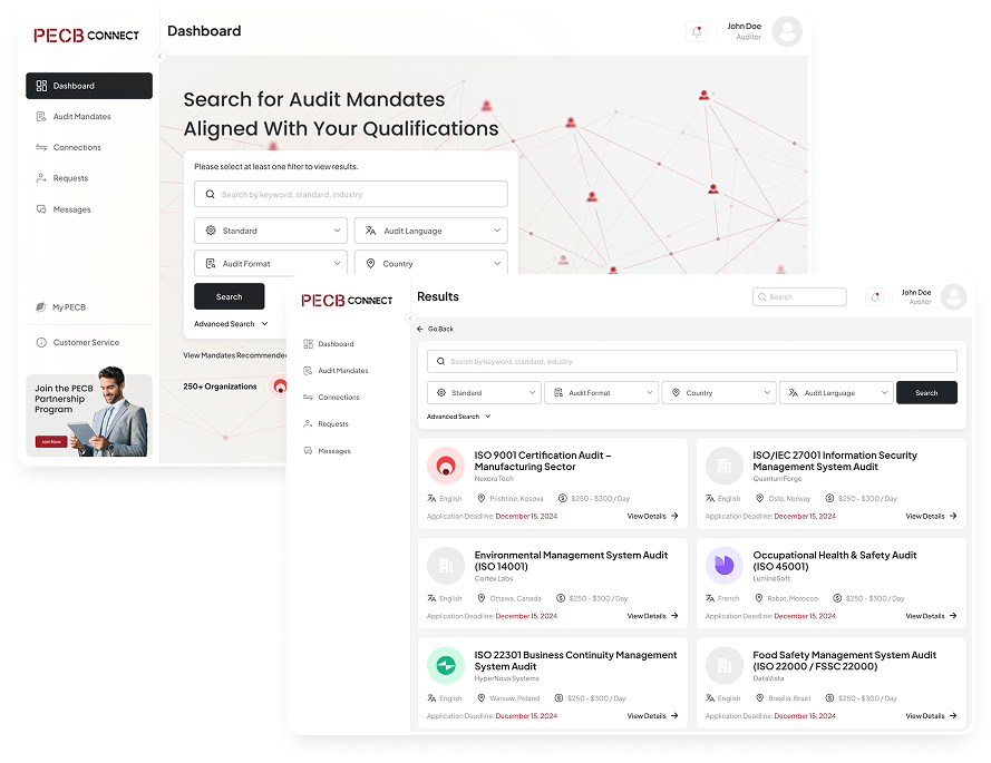 Showcase your expertise and access global opportunities. Join PECB Connect to find relevant audit mandates, collaborate with organizations, and advance your career.